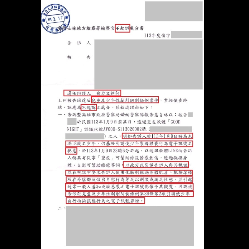 ✨【引誘未成年拍攝裸照 - #不起訴 (兒少性剝削防制條例) 】