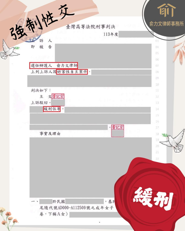 #俞力文律師事務所 #俞力文律師 #成功案例 #強制性交 #緩刑 #性侵 #線上諮詢 #刑事律師 #刑事案件