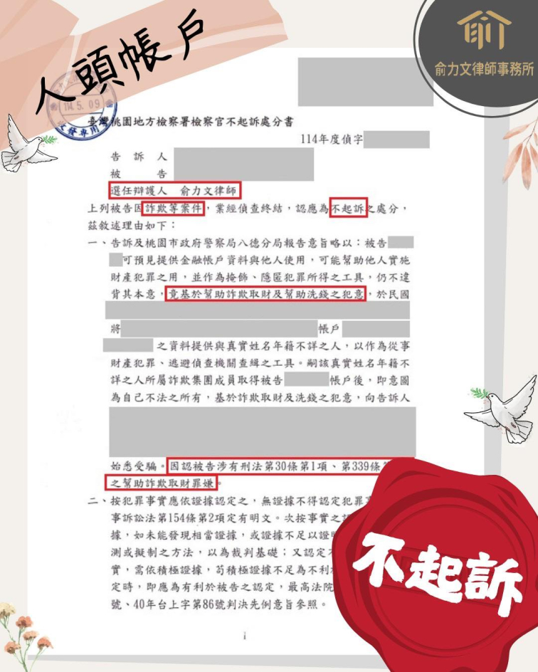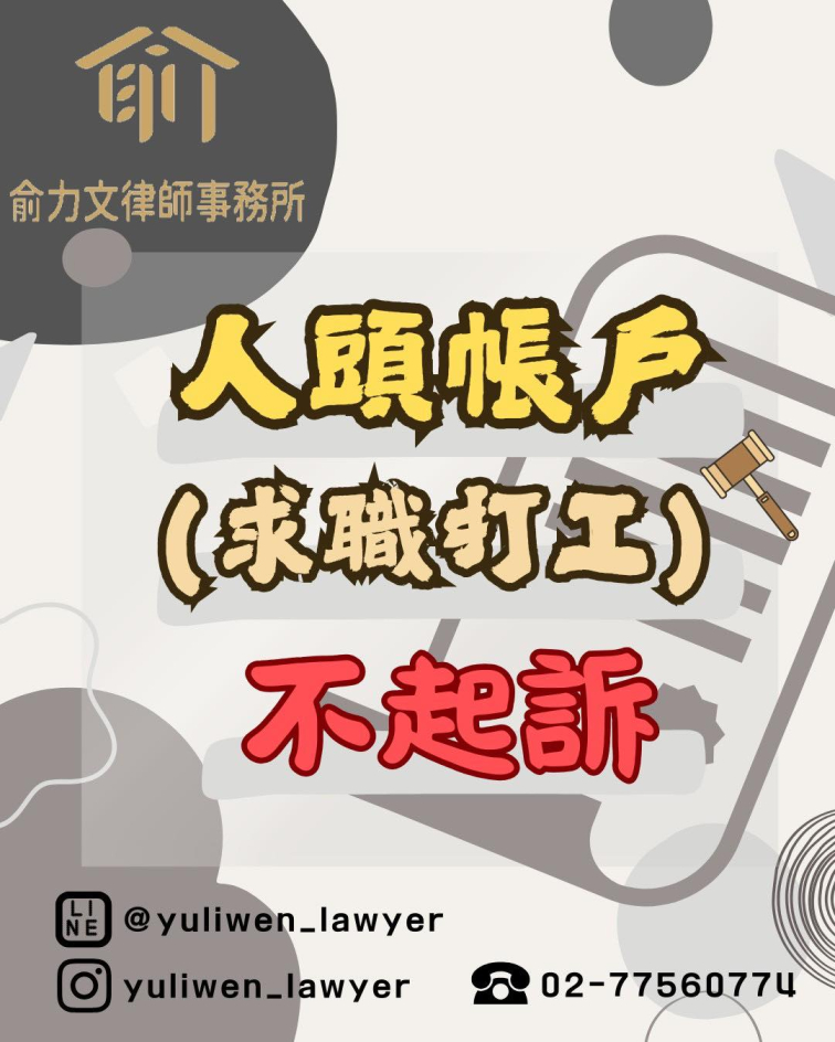 #不起訴 #無罪 #律師事務所 #洗錢防制法 #律師 #法律諮詢 #洗錢 #人頭帳戶 #刑事律師 #訴訟 #24小時緊急陪偵