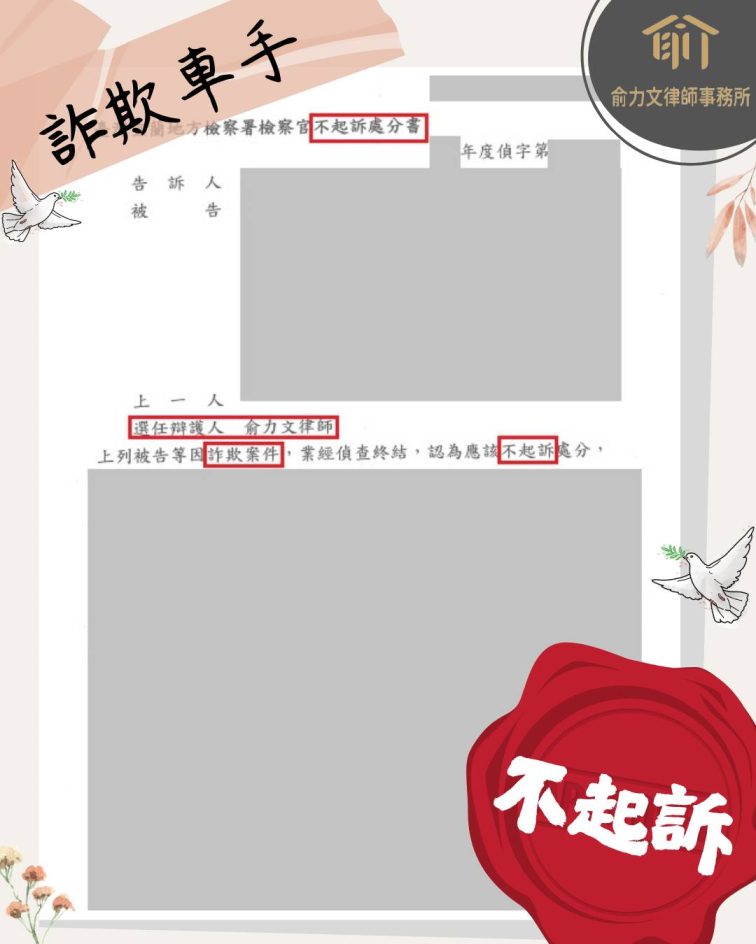 最終,經檢察官審酌全案後,認定當事人並無共犯故意,裁定不起訴處分,讓當事人得以重獲清白,平安回歸生活。